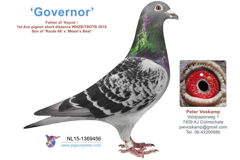 In 2017, Piet unfortunately had to quit pigeon racing and entrusted me with the son of Route 66 and the ,· daughter of Messi. I named this dark chequer pigeon Governor. Along with Governor, Piet also gave me Blue Opal, the hen that would later become the mother of Kayne. He had full confidence that his pigeons would bring success, and he was right. From the very first pairing of Governor and Blue Opal, a new star was born: Kayne.